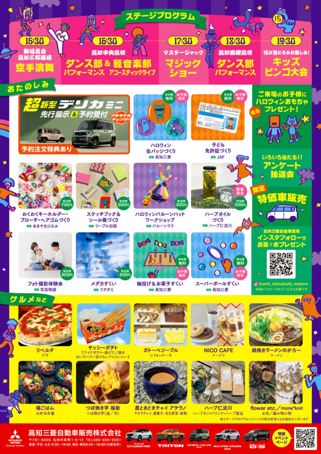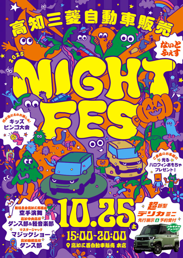 高知三菱ナイトフェス2025 Tweet 「高知三菱自動車販売ナイトフェス2025」フライヤー 裏面 毎年、2回行われている高知三菱自動車販売さま主催のナイトフェス。この年はハロフィン時期に開催されたため、イラストもハロウィンテイストに変更。イラストは高知三菱さんではおなじみのACOさん。テイストはアメリカンな雰囲気にとお願いしました。 2026-02-16 投稿先 Flyer, Poster ← 過去の投稿へ 次の投稿へ →