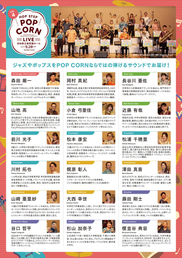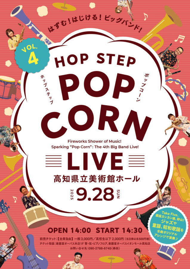 「HOP STEP POP CORN」LIVE Tweet フライヤー表面 フライヤー裏面 高知のビッグバンド「HOP STEP POP-CORN」さんのLIVEフライヤーを作成しました。ポップさを出しつつも子どもっぽくならないようデザインしました。チケットや譜面台も同デザインに合わせて制作させていただきました。 2025-08-16 投稿先 Flyer ← 過去の投稿へ 次の投稿へ →